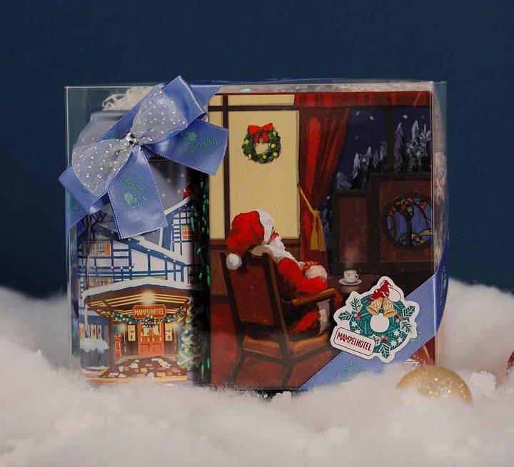 1894年に創業し、2024年にリニューアルオープンを果たした軽井沢を代表する老舗ホテル「万平ホテル」。国の登録有形文化財にも指定されたハーフティンバー様式の建物がアイコニックで、クラシカルで美しいインテリアデザインにもファンが多いホテルだ。この万平ホテルから、アルプス館の建築の外観が描かれた紅茶缶と、サンタがホテル内でくつろぐ様子を描いたキャラメルサンドのギフトが発売中。レトロ建築好きにぜひ贈りたい、季節限定のセットだ。