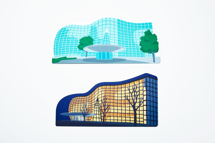 お土産としてだけでなく、自分用にも展示を見た後にゲットしたいのが"型抜きポストカード"。黒川紀章のアイコニックな建築がポップに描かれており、朝と夜の両方の景色を用意している。さらにメッセージを書く裏面は、きちんと国立新美術館の内装になっているという細かな演出。建築好きには必見のアイテムだ。