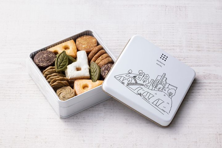 大阪・関西万博でも注目を浴びた建築家・藤本壮介が設計した群馬県前橋市の「白井屋ホテル」より、ホテルの建築が描かれたクッキー缶が登場。ホテル敷地内にある「⽩井屋ザ・パティスリー」の パティシエが一つ一つ丁寧につくったクッキーがぎっしりと詰まっている。中でもココナッツのサブレは、白井屋ホテルの特徴的な外観をイメージしたもので、テンションの上がる愛らしさ。