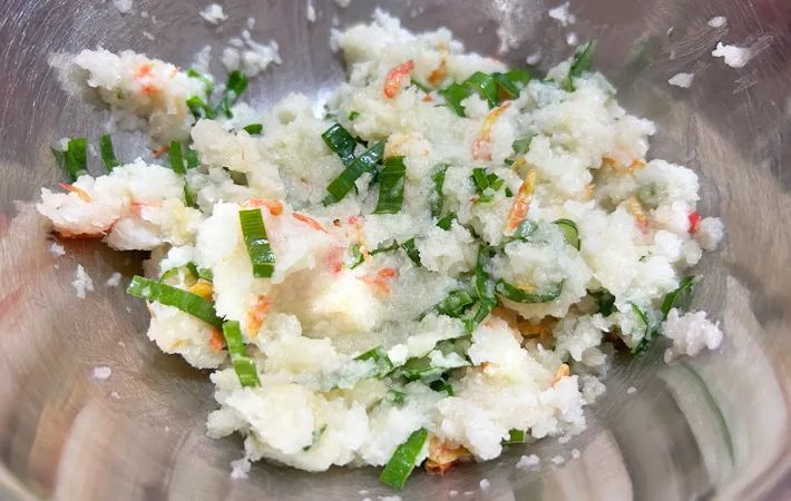 桜エビ、ネギ、薄力粉、片栗粉、顆粒だしを加えて、全体が均一になるまでよく混ぜましょう。