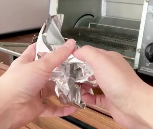 まずは、アルミホイルをくしゃくしゃにして、トースターに敷いてください。