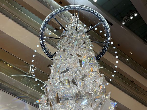 表参道ヒルズの本館 吹き抜け大階段には、多面体プリズムが吹き抜け空間を煌びやかに彩り、光のリングが軽やかに踊る、高さ約10メートルのクリスマスツリーが登場しています。