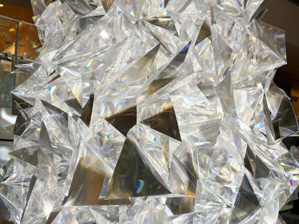 印象的なのは、約1,000個のプリズムエレメントによる多面体。そこに光が反射することで、空間全体がキラキラとした光に包まれていました。