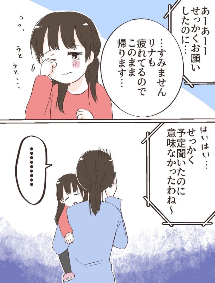 寄れたらでいいと言っていたはずなのに、お菓子が買えなかったと分かった途端、不満をあらわにする義母。その態度に内心イラッとしましたが、「すみません、リナも疲れているのでこのまま帰ります」とだけ伝えます。「せっかく予定聞いたのに意味なかったわね~」義母は嫌味たらしく言ってきましたが、言い返す気力も残っていなかった私。眠ってしまったリナをそっと抱き上げながら帰路につきました。