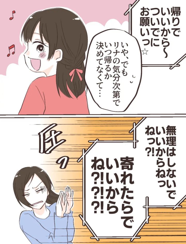 義母は「帰りでいいから、ついでにお願い!」と必死に頼み込んできますが、正直こちらとしてはあまり行きたくない気持ちでいっぱいです。リナの気分次第で帰る時間が読めないことを伝えても、「寄れたらでいいから、ね!」と食い下がる義母。どうしても買ってきてほしいという圧がひしひしと伝わってきます。