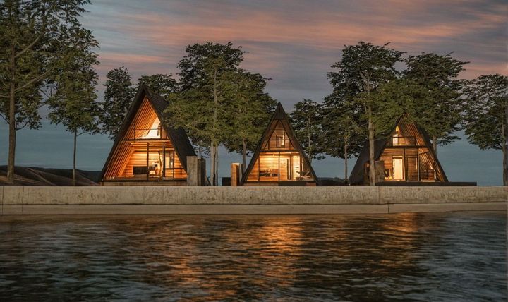 そんな自然豊かな環境に佇む同施設。敷地内は三角屋根が特徴的なヴィラが3棟。室内には自然素材を多用、また青木湖の豊かな自然と調和するカラーコーディネーションを取り入れた。湖畔側には三角屋根ならではの大きな窓を設け、屋外の自然と一体になるような開放感あふれる空間を実現。さらに、広々としたデッキスペースと、ロウリュウが楽しめるサウナを備える。食事は客室内のキッチンで自由に調理できるほか、ケータリングサービス(オプション)も利用可能だ。