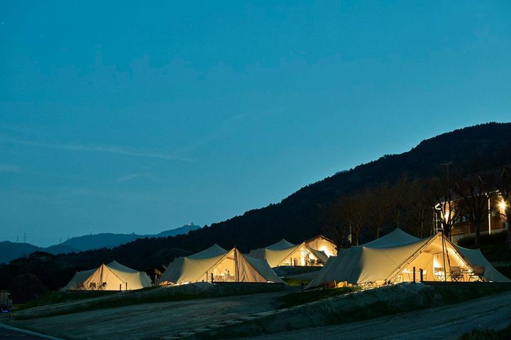 「Snow Peak YAKEI SUITE ABURAYAMA FUKUOKA(スノーピークヤケイスイートアブラヤマフクオカ)」は、福岡市中心部から車で30分の油山地区にオープン。都市の夜景と豊かな自然を同時に楽しめる、複合体験型アウトドア施設だ。2024年4月にアウトドアメーカー大手のスノーピークが、JR九州リージョナルデザインとのフランチャイズ契約により開業。「自然に還るラグジュアリーな体験」をテーマに掲げる。
