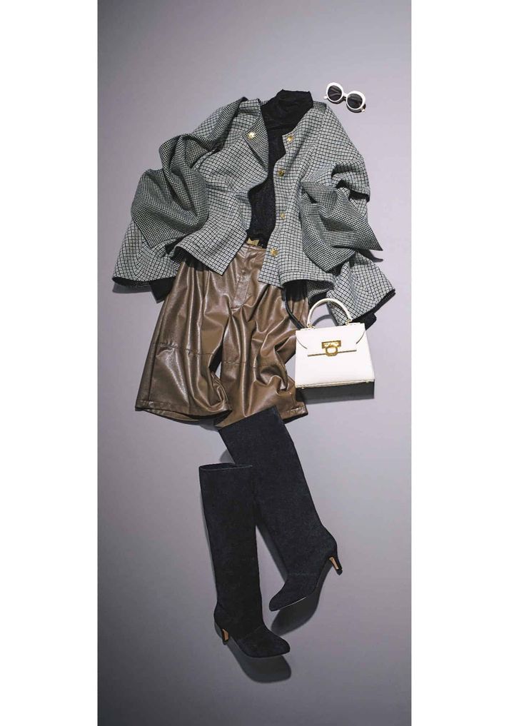 ブラウン系のレザーハンパ丈パンツに、上品なチェックジャケットをひと羽織。ワイドなシルエットが脚のラインを曖昧にし、華奢見えを叶えてくれます。クラシカルなのに重さが出ず、40代にちょうどいいモード感が漂うスタイルです。