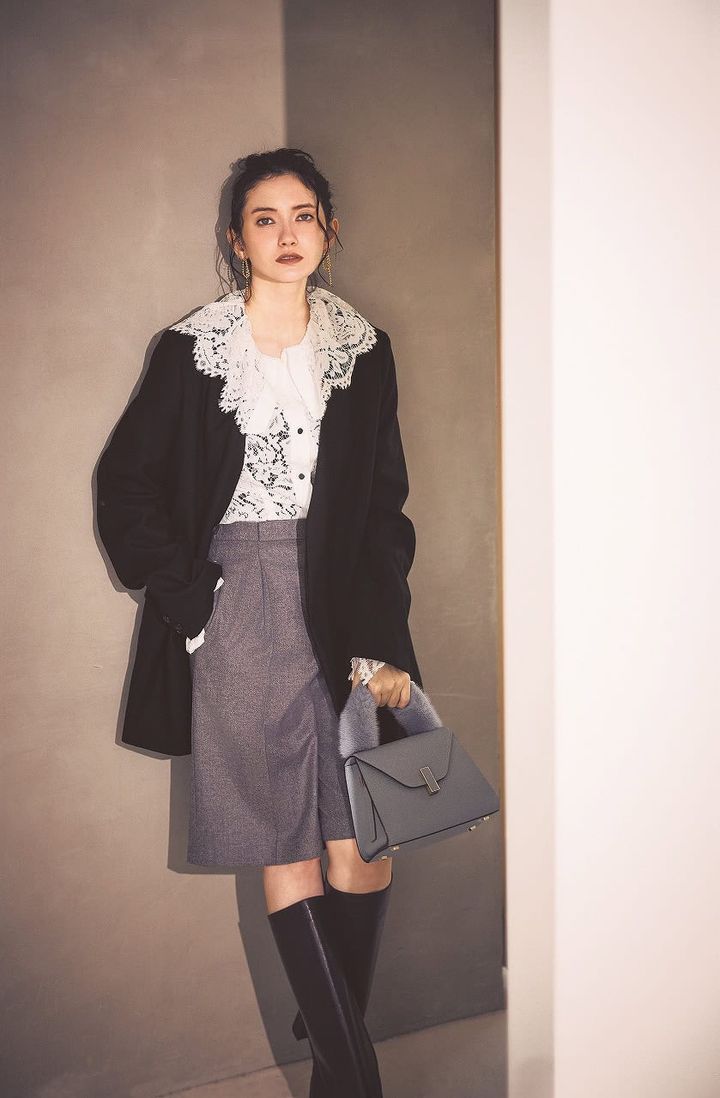 大きめレース襟のブラウスを主役に、グレーのハンパ丈パンツで甘さを程よくセーブ。ロングブーツの辛さと縦ラインが全体を大人に引き締めます。パンツのハリとブーツの組み合わせで重心が上がり、小柄さんでもバランスよく見えるスタイルです。