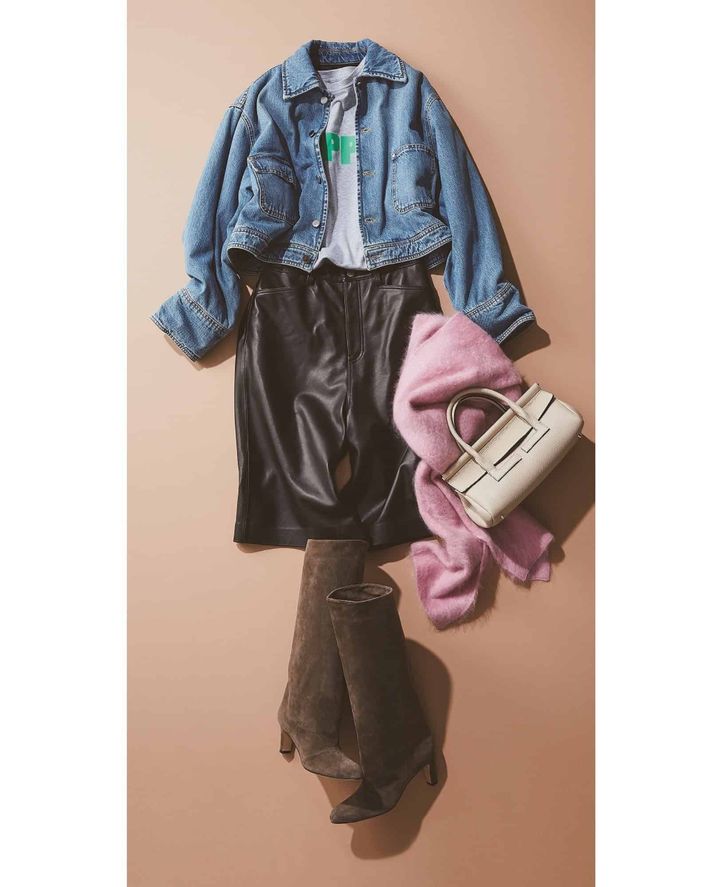 ショート丈デニムのジャケットにレザーのハンパ丈パンツを合わせた、カジュアルなのに今っぽい着こなし。パンツのゆとりが腰位置を高く見せ、黒ロングブーツの引き締め効果で脚をまっすぐ長くみせます。