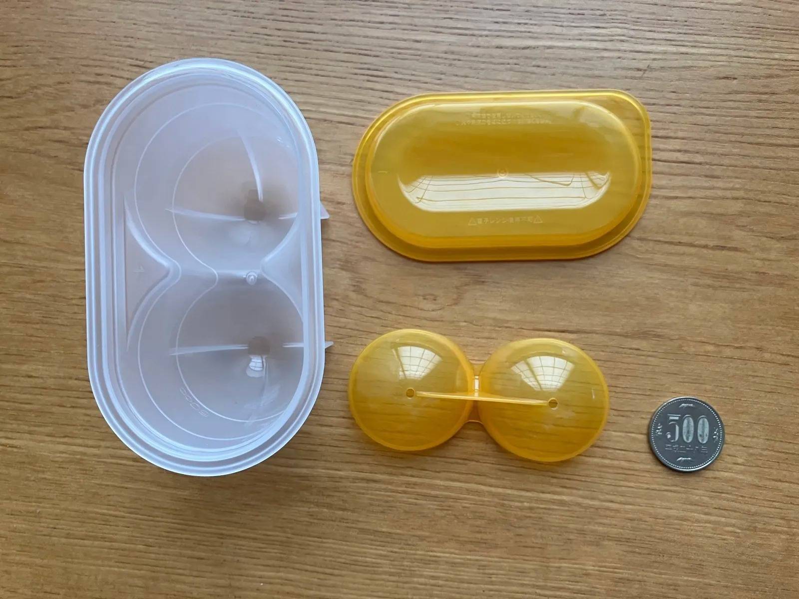 卵が2個入る容器に、外蓋と落とし蓋がセットで入っています。