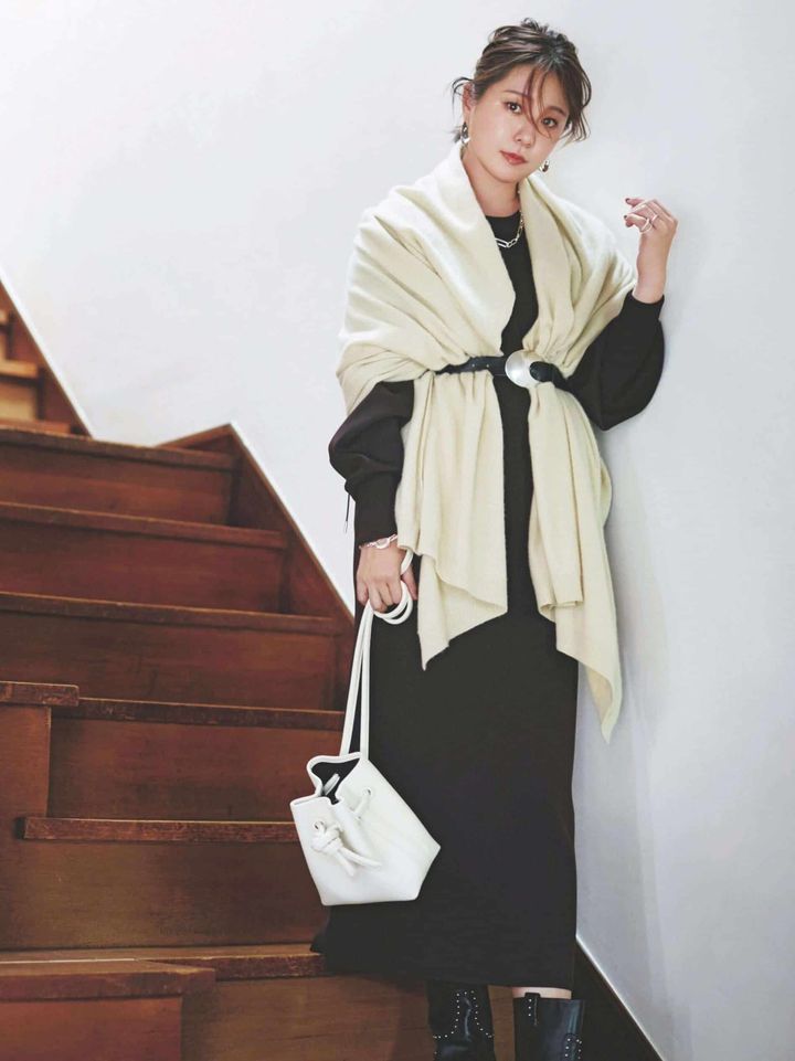 柔らかな色味のストールであえてボリュームを持たせることで、黒ワンピースのIラインを最大限に強調。ウエストラインを絞りを効かせることで立体感を演出し、肩まわりの厚みをナチュラルにカモフラしてくれます。