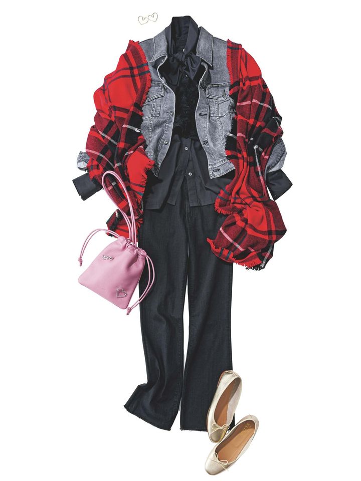 ストール¥45,100(アソース メレ/アイネックス)デニムジャケット¥40,700(ヤヌーク/カイタックインターナショナル)ボウタイブラウス¥19,800(ヴェルソー/ジオン商事)チュールベスト¥26,400(ジェーン スミス/シップス インフォメーションセンター)デニムパンツ¥42,900(マザー/リトルリーグ インク)バッグ※ブローチはカスタマイズ可能¥39,600(ヴァジック/ヴァジックジャパン)バレエシューズ¥35,200(スペルタ/フラッパーズ)ピアス¥38,500(プラウ)