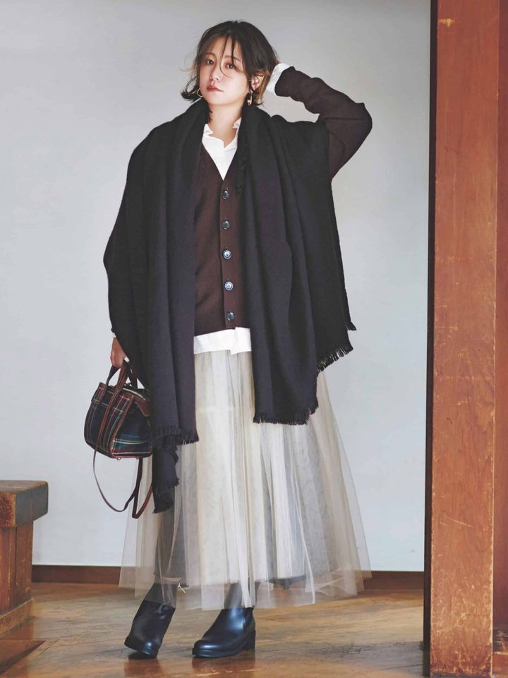 ストールの存分なサイズ感を味方に、上半身をざっくり覆うようなボックスシルエットを構築。そのままスカートにつないで、実際のラインをカバー。アウターとストールはカラーを揃えるのがコツ。