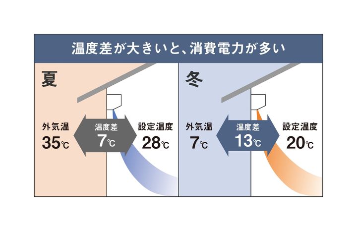 夏もですが、エアコン「室外温度」と「設定温度」の差が大きいほど消費電力がかかります。