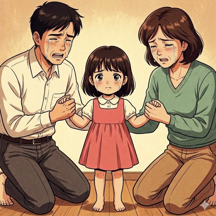 娘は必死に、私と夫の手を自分の小さな胸の前で引き寄せ、無理やり重ね合わせようとしました。