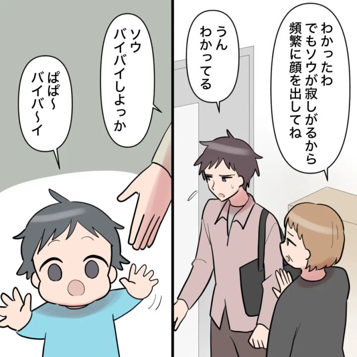 義母はそそくさと帰ろうとするトモヤに、「ソウが寂しがるから頻繁に顔を出してね」と声をかけました。トモヤは気まずそうに目を伏せ「わかってる」と返事をします。「ぱぱ~バイバ~イ」ソウくんは相変わらずトモヤをパパ呼ばわりしたまま。