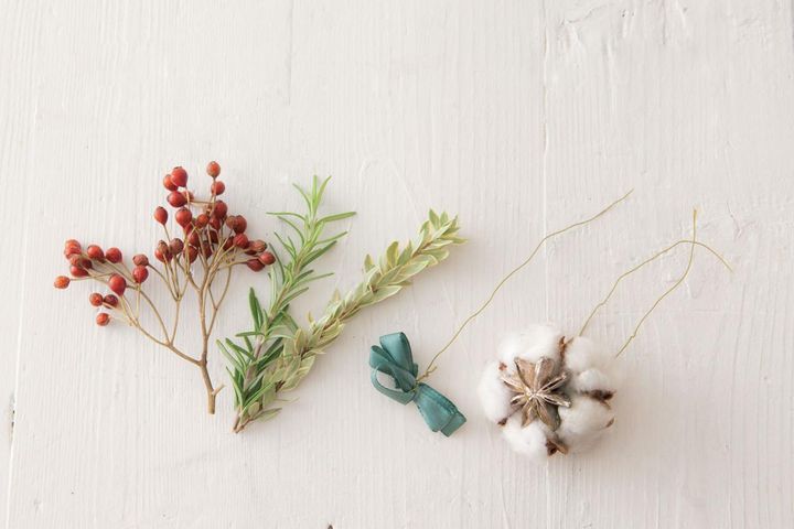 つるを編んで丸めた市販の台に、マートルとローズマリーの束をバランスよく留めつけ、雪を思わせる綿の実と赤い実を飾ったらオリジナル感のあるリースが完成。