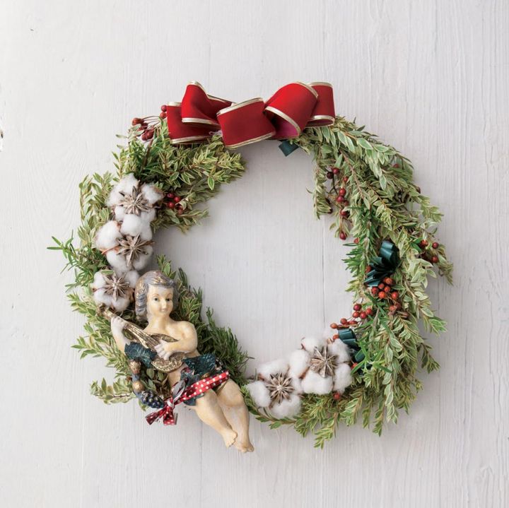 赤いリボンを飾り、桐原春子さんがニューヨークで一目ぼれしたという天使の飾りも留めて。クラシカルな趣が漂うリースになりました。
