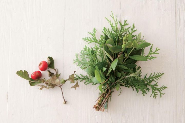 クリスマスリースにはベイなどの常緑樹を使うのが基本です。今回はふさふさとした葉が印象的なヒバをメインにしました。ベースとなる土台からしっかりと作れば見応え十分の豪華なリースができます。