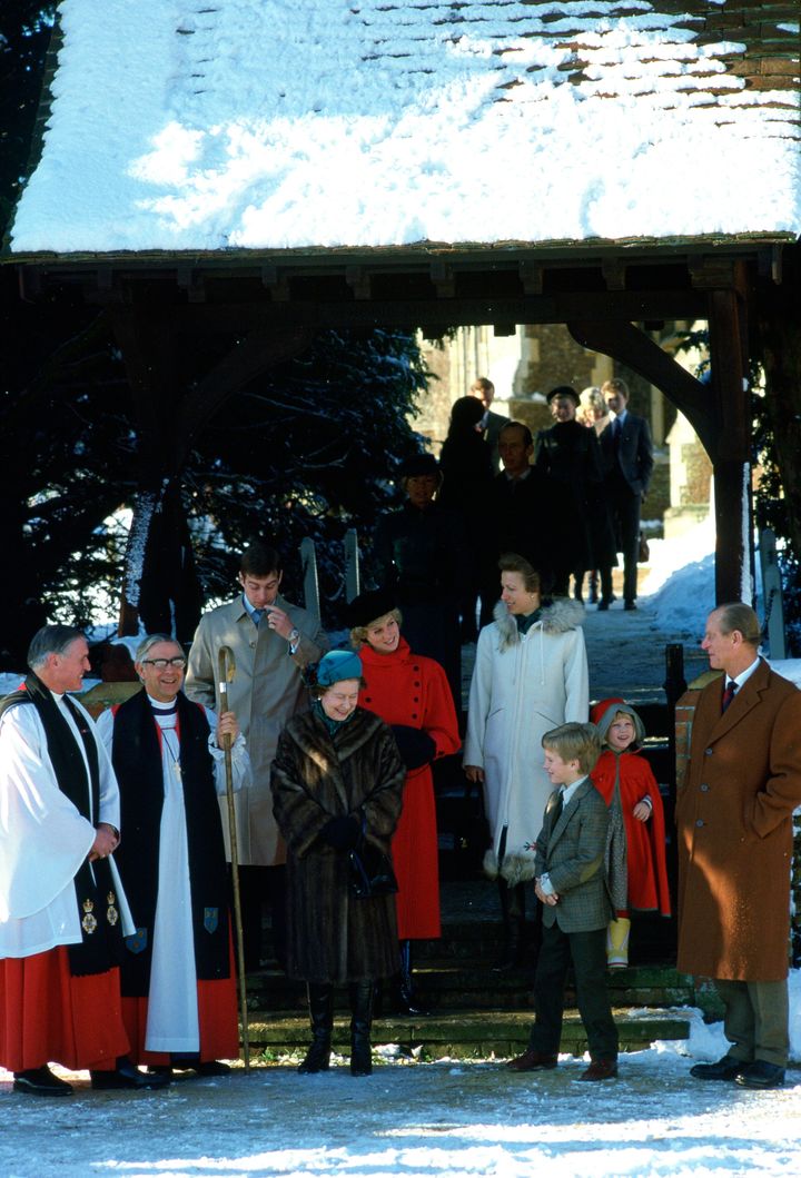 サンドリンガムでクリスマスを迎えたロイヤルファミリー(左から、アンドルー王子、エリザベス女王、ダイアナ妃、アン王女、礼拝に出席した子どもたち、フィリップ殿下)