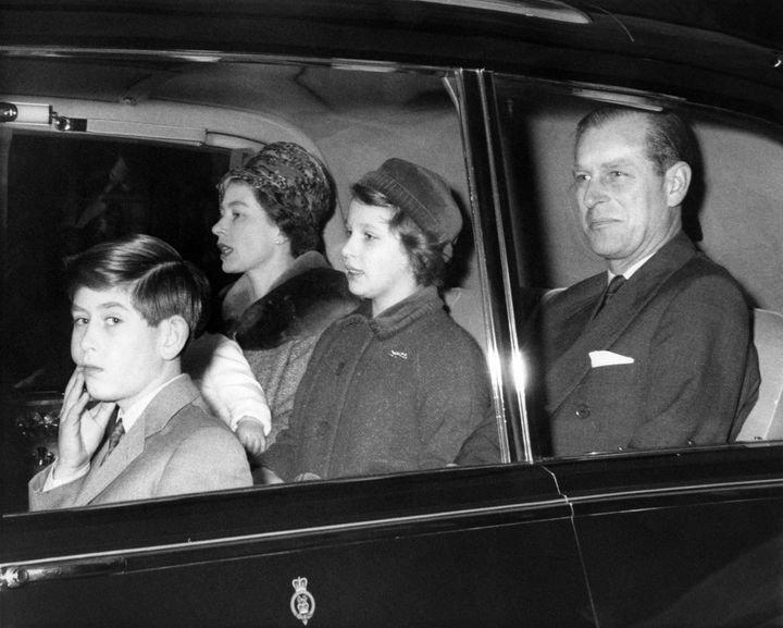 クリスマスの休暇を過ごすサンドリンガム行きの列車に乗るため、車でロンドンのリバプール・ストリート駅に向かうロイヤルファミリー(前列はチャールズ皇太子、後列は左奥から、エリザベス女王、アン王女、フィリップ殿下)