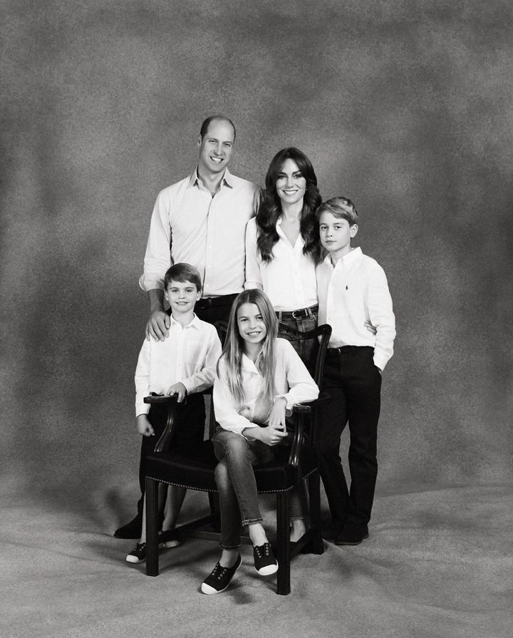 白のシャツとダークカラーのパンツでそろえたリンクコーデとモノクロのポートレートでクリスマスの挨拶をしたウィリアム皇太子一家
