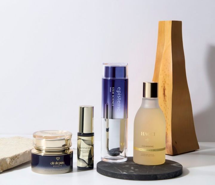 商品右から:メルティグレース オイルクレンジング200mL 7370円(ハッチ)、ステムサイエンスローションc 150mL 1万7050円(エピステーム)、アンフィネス メンテナンス ショット10 24mL 1万3200円(アルビオン)、クレームアンタンシヴR(ニュイ)50g 1万9250円(クレ・ド・ポー ボーテ)