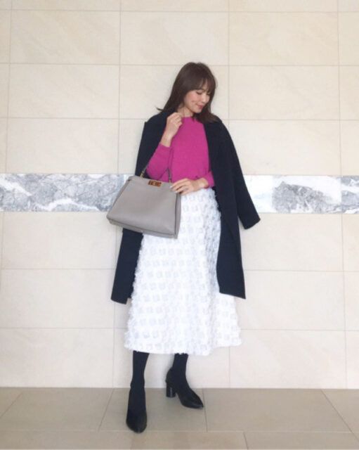 スナップで着用している白スカートのブランドは>>ELENDEEK(エレンディーク)