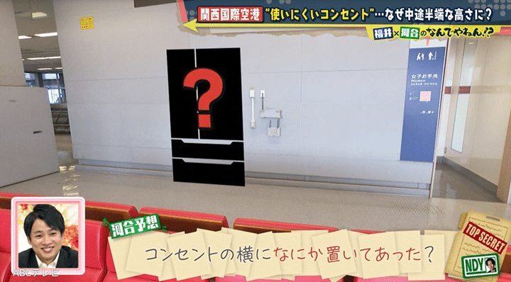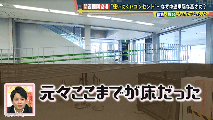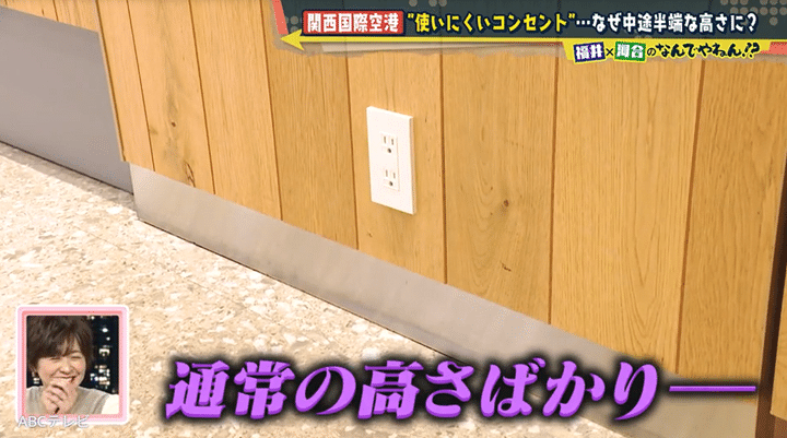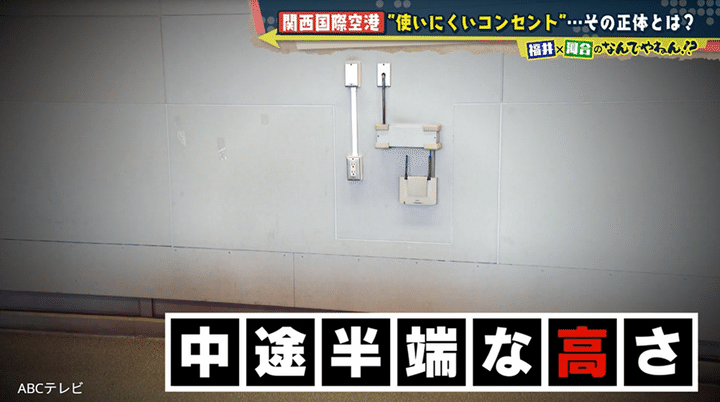 関空こと関西国際空港には、謎の“使いにくいコンセント”がある。普通は足下にあるはずのコンセントが、中途半端に高い位置にあるのだ。タレントの河合郁人とABCテレビの福井治人アナウンサーが調査したところ、関空ならではの秘密が明らかになった。