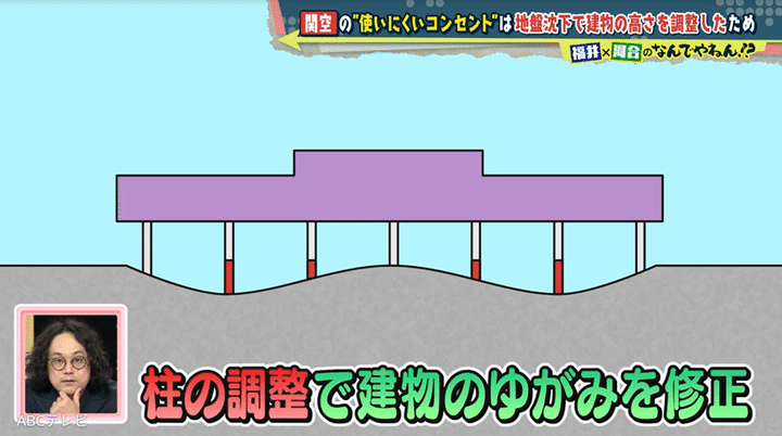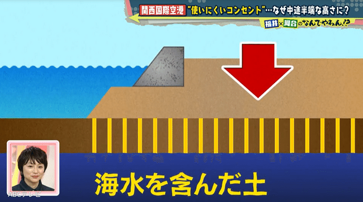 関空は、大阪湾を埋め立ててできた人工島。建設時は、海底に100万本ものパイプを打ち込んで地盤を固める、いわゆる地盤改良が行われた。しかし、地盤改良できない深い部分の大量の海水を含んだ土は、固まるまでターミナルビルの重みでゆっくり沈んでしまう。