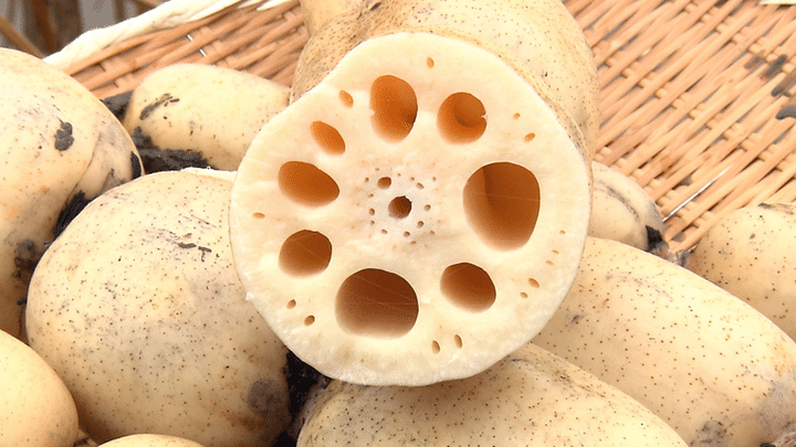 畑ではベトナム出身の実習生、チーさんがレンコンの掘り方を教えてくれる。ホースの水圧で泥の中に埋まっているレンコンを探し、傷つけないように優しく掘るのがポイントだ。