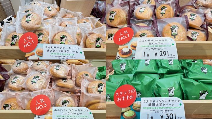 左上から時計回りに:「ふんわりパンケーキサンド あさぎりミルククリーム」1個261円、「ふんわりパンケーキサンド あんバター」1個291円、「ふんわりパンケーキサンド ミルクコーヒー」1個291円、「ふんわりパンケーキサンド 静岡抹茶クリーム」1個301円 ※季節ごとに展開フレーバーが変わります