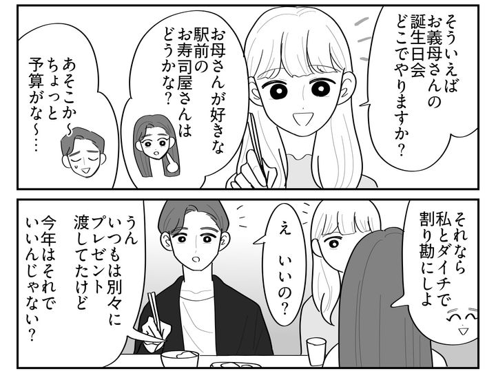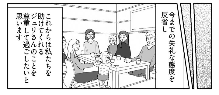 私はジュリさんへのイラ立ちのあまり、義母の誕生日のお祝いを「ジュリさん抜き」で行おうとしていました。けれど今はお互いを理解しあえる関係になっています。最終的には費用を分担して一緒にお祝いする話でまとまりました。