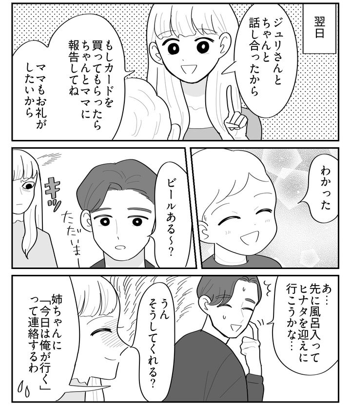 夫は義母から説教され、ジュリさんに任せっきりで他人事だった自分の態度を反省したようです。自分が車を出せるときは送迎するようになりました。ジュリさんもあれから、ヒナタに何かしてあげたいときには必ず私に確認してくれます。
