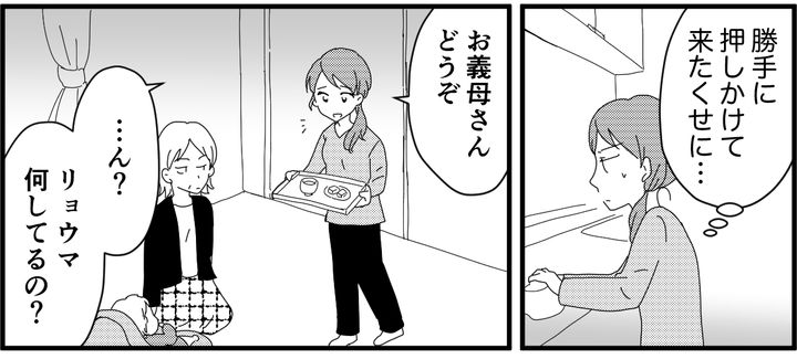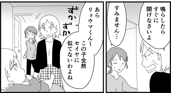 嫌々ドアを開けると、案の定、義母が押し入ってきました。息子を「セイヤに似てない」と言い放ち、お茶を要求。