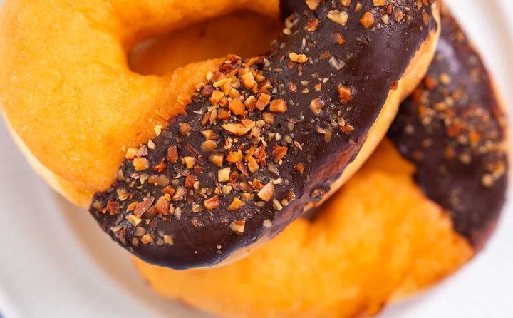 ドーナツの半分くらいにチョコがかかっていて、その上にアーモンドがたくさんのっています。