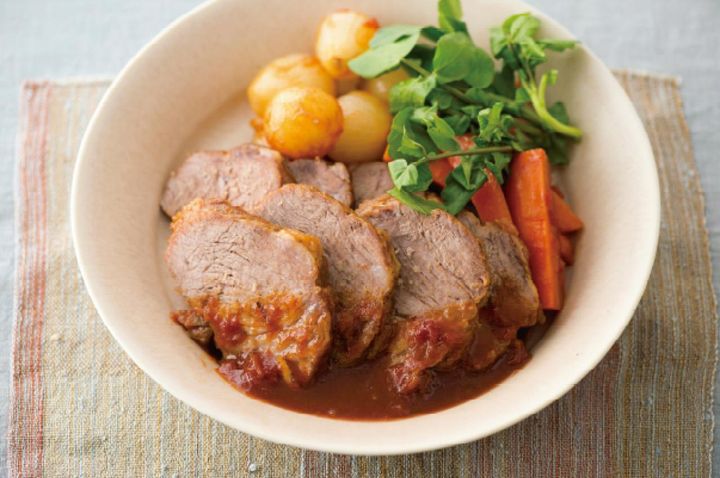 ❸トマト缶、マーマレード大さじ3、しょうゆ大さじ2、【A】を加えて30分煮る。5㎝長さの棒状に切ったにんじん、皮をむいたペコロスを加えて15分煮、強火にして半分の量になるまで煮汁をとばし、マーマレード大さじ1、しょうゆ大さじ½を加え、ひと煮立ちさせる。