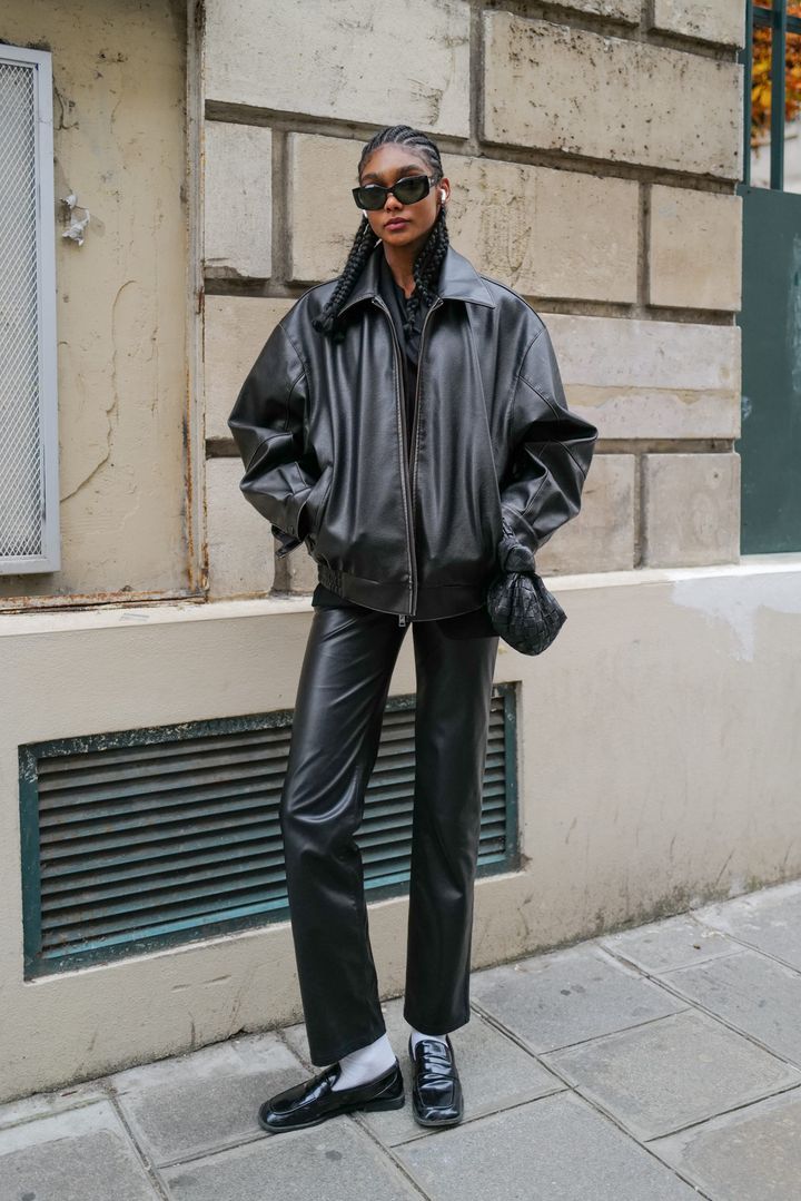 オーバーサイズのレザーブルゾンに、レザーパンツを合わせてひときわクールに。足もとはローファーを選んで、ほどよく力の抜けた着こなしに仕上げた。ラフに持った「ボッテガ・ヴェネタ」の“ミニジョディ”でこなれ感をプラス。