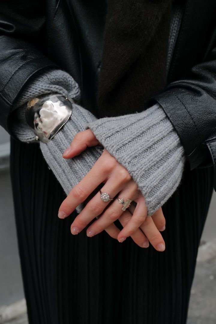 ニットの上からメタリックなバングルをトッピングしたり、モチーフリングで表情を出したりと、冬コーデをチャーミングに彩った手元コーデ。