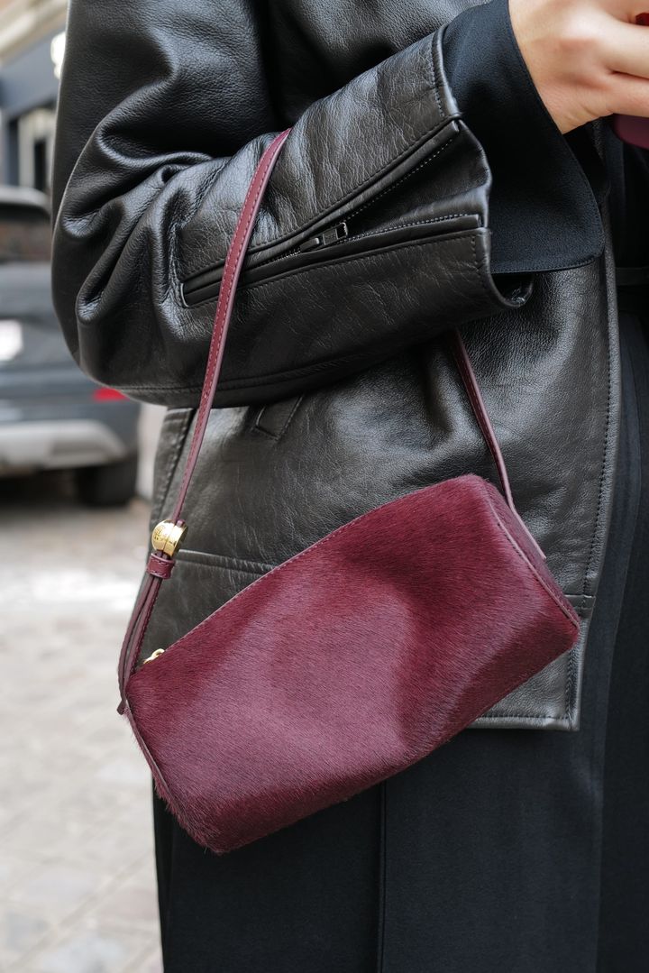 「ジェイ クルー」のミニバッグは、横長シルエットが今っぽいデザイン。バーガンディカラーで冬コーデに華やぎを。