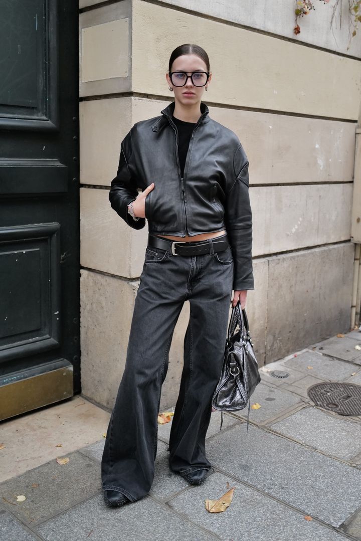 モデルのミアの定番は、カジュアルに着こなせるブルゾンタイプのレザーアウター。デニムにレザーを効かせたタフなブラックコーデは、ビッグフレームメガネのギークな遊び心がポイント。