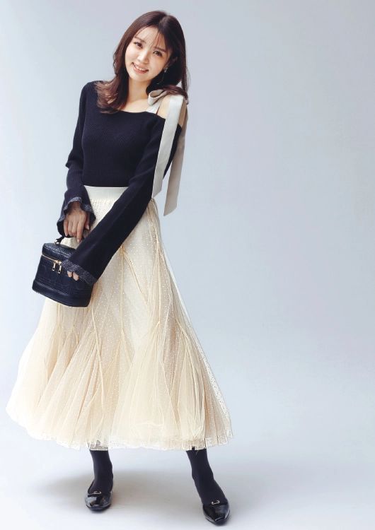 ワンショルダーニットにあしらわれたリボンと、チュールスカートの色をリンクさせて。バッグや靴は締め色で統一してシックに。繊細なチュールは歩くたびにふわりと揺れて、ミーハー感も上々、高揚感を盛り上げてくれます。