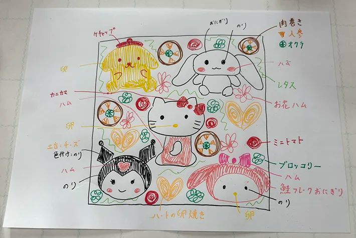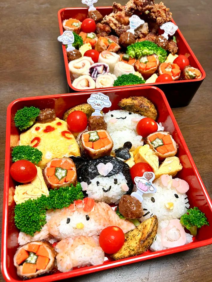 色とりどりのおにぎりやオムレツで、ハローキティやシナモロール、ポムポムプリンといった人気キャラクターを見事に再現。