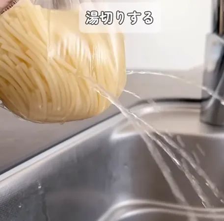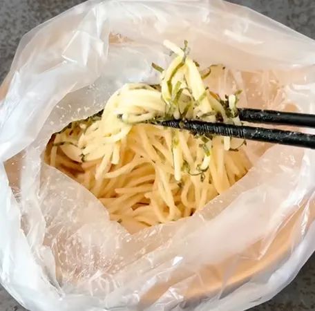 ご飯の時と同じ手順で、『アイラップ』に麺と水を入れ、空気を抜きながら袋を閉じます。