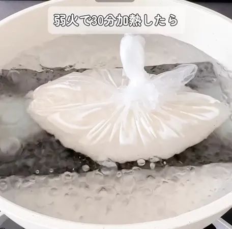 30分加熱したら、袋を取り出してください。あとは10分蒸らせば、ホカホカのご飯が完成!