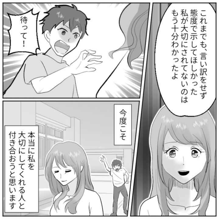 彼女を大切にせず、いよいよ別れを切り出してからすがりついてきた彼氏。次はもっと大切にしてくれる人と付き合うと心に決めた主人公でした。