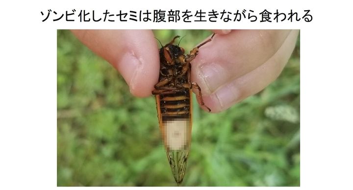 ゾンビ化したセミは生殖器を中心とした腹部が脱落して、マッソスポラの胞子嚢に変化しているため既に子孫は残せませんが、性行為の真似事を通して、相手を感染させることができます。