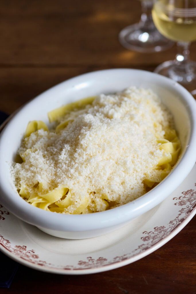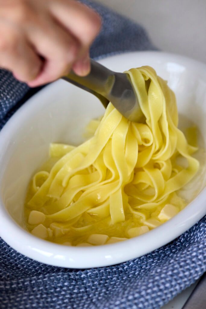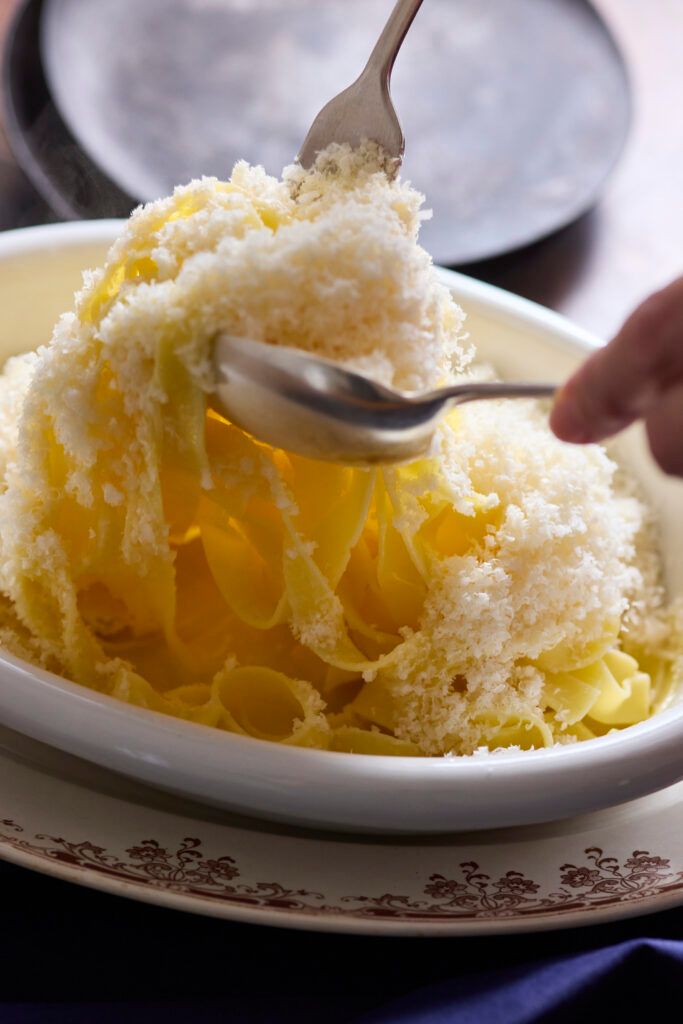 このパスタは難しそうに見えますが、じつはとても簡単。あつあつに温めた器にバター、レモン汁、昆布だしを加えて、柔らかくゆでたフェットチーネを加えたら、驚くほどたっぷりのチーズをよーくからめるだけ。こんなに簡単なのに、まるでお店のようなビジュアル!