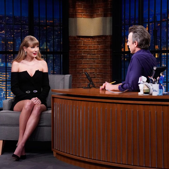 アメリカの深夜のニュース風刺トーク番組「レイト ナイト ウィズ セス マイヤーズ」に出演したテイラー。艶やかなブロンドのストレートヘアとレディなブラックドレスが霞むほどの美脚を披露。
